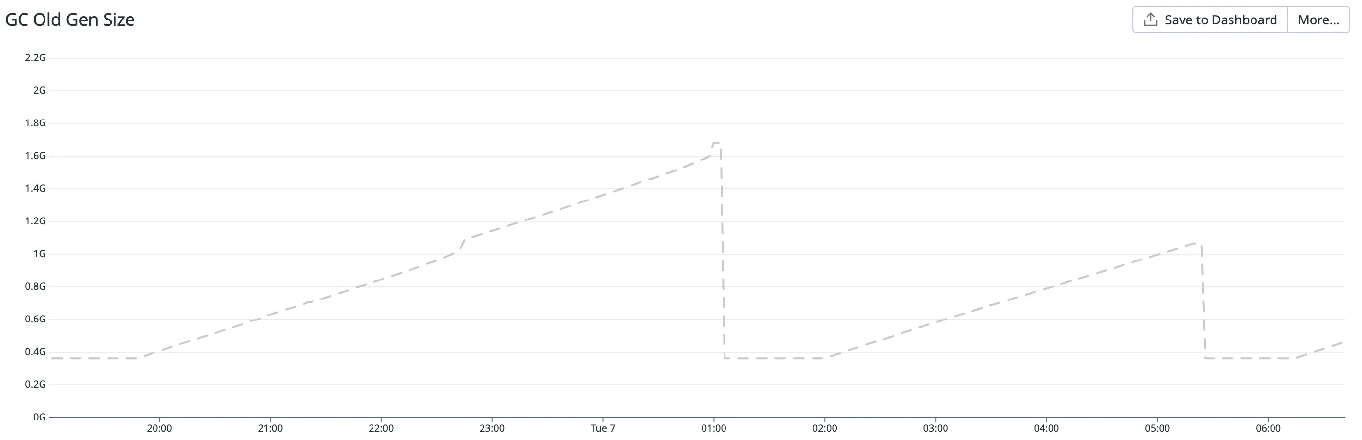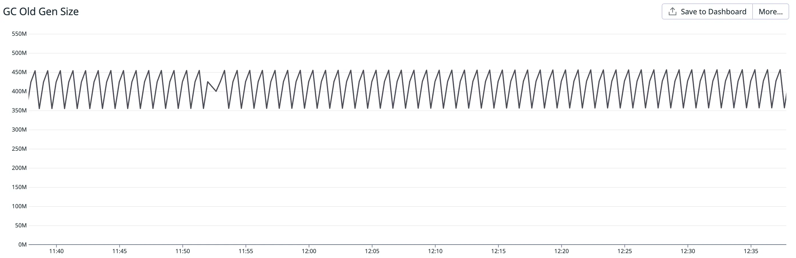 해당 코드를 배포하고 난 직후엔 아무 문제 없이 의도한대로 잘 동작하였으나, 코드를 배포한 지 며칠이 지나자 OOM이 발생해 어플리케이션이 강제로 재시작되었고 다시 며칠동안은 문제가 없다가 OOM이 발생하기를 반복했습니다. 아래의 두 사진 중 위의 것은 문제가 된 인스턴스의 JVM old generation size 추이를 나타낸 그래프이고, 아래의 사진은 같은 메트릭에 대해 문제가 없는 인스턴스의 일반적인 그래프입니다.