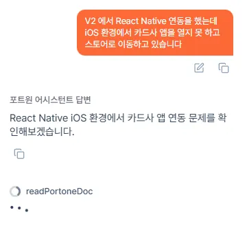 LLM의 답변 속도를 우리가 직접 획기적으로 줄이는 건 불가능했죠. 대신 이용자 입장에서의 '체감 시간'을 줄이려고 했습니다. 단순히 로딩 바가 도는 게 아니라, "현재 개발자 문서를 검색하고 있습니다...", "관련 내용을 분석 중입니다..." 처럼 AI가 현재 수행 중인 작업을 실시간으로 보여주었습니다. (Perplexity나 Gemini처럼요.) 이 작은 장치가 고객이 이탈하지 않고 답변을 기다리게 만드는 핵심 UX가 되었습니다.